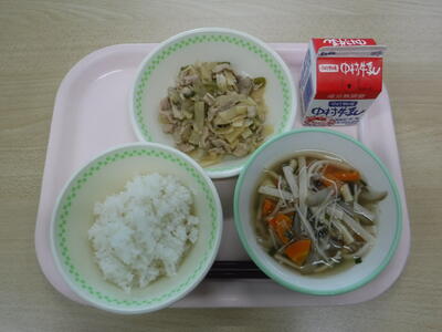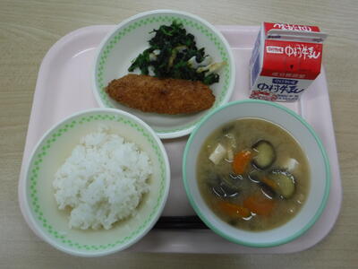 【麦ごはん いわしの生姜煮 野菜のお浸し たまねぎのみそ汁 牛乳】