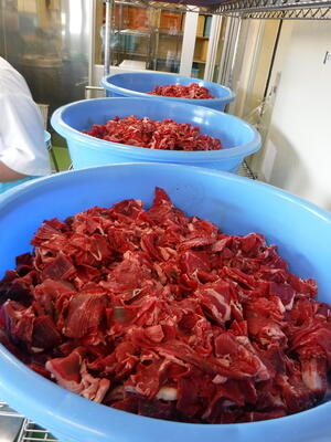 今日は、人間の体についてのクイズを出します。問題です。人間の腸の長さは、どれくらいでしょう? ①身長と同じ長さ ②身長の2倍くらい ③身長の5倍くらい 答えは・・・・③の身長の5倍くらいです。 大人の人だと、7メートルから8メートルくらいあるそうです。それだけ長い腸を通る中で、食べ物は消化され、栄養を体の中に取り込みます。さて、みなさんが、今、給食を食べている姿勢はどうですか?背中を丸めて食器を持たずに食べている人はいませんか?背中を丸めていると、おなかの中の胃や腸が圧迫されて、食べたものがうまく消化できません。せっかく食べた食べ物の栄養が体の中に取り込まれないと、もったいないですね。背中をのばして、腰を立てて、よい姿勢で食べましょう。今日の川南町でできた食べ物は、米、豚肉、じゃがいもです。