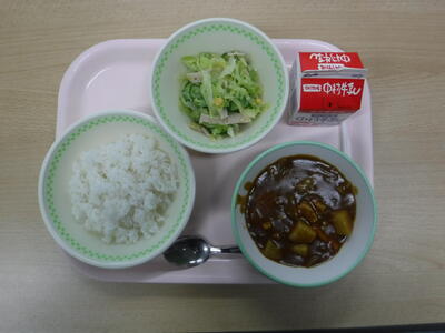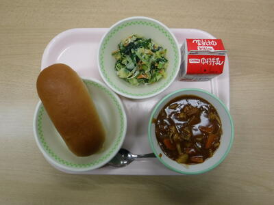 【麦ごはん カレー豚じゃが 菜の花とほうれん草のごま和え 牛乳】