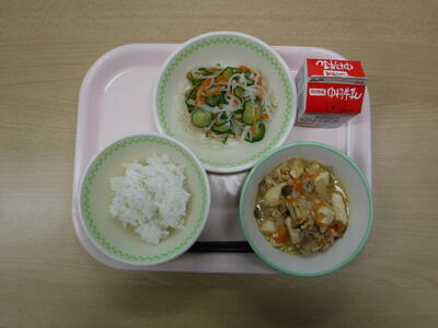 【麦ごはん 厚揚げの中華に さっぱりごぼうサラダ 牛乳】