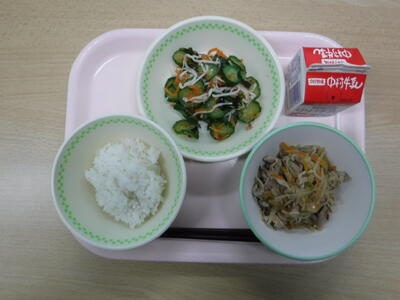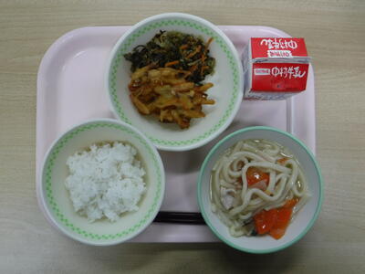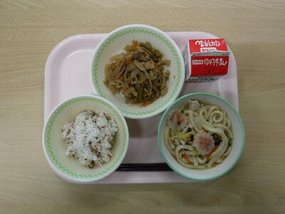 【(減)梅菜めし お祝いうどん れんこんのきんぴら 牛乳】