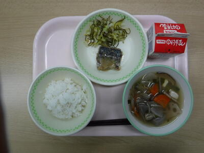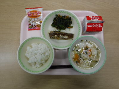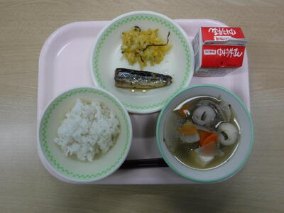 【麦ごはん フカのごまみそあえ 根菜汁 牛乳】