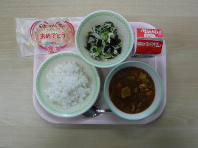 【チキンカレー(麦ごはん) 海藻サラダ お祝いクレープ 牛乳】