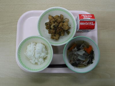 【麦ごはん 鶏肉のからあげ キャベツのおかか和え わかめ汁 牛乳】