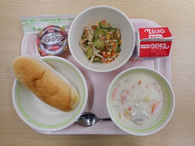 【こめっこパン 汁ビーフン きゅうりの中華風味漬け プリン 牛乳】