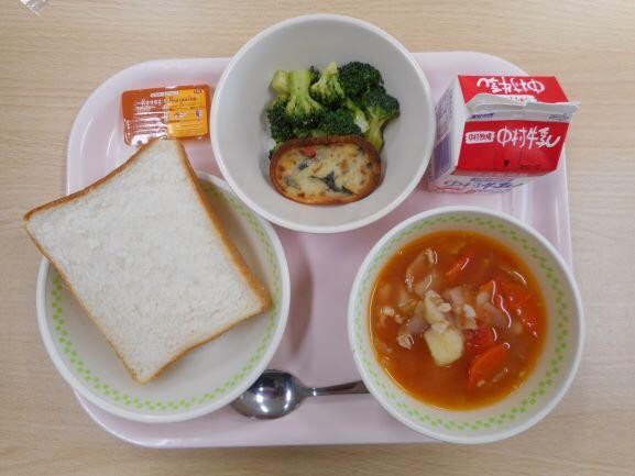 【食パン オムレツ ゆでブロッコリー 野菜スープ 黒豆きなこクリーム】