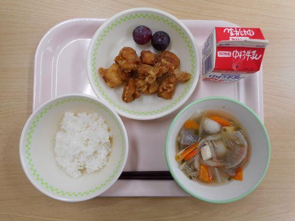 長かった夏休みが終わり、今日から2学期のスタートです。2学期最初の給食は、カレーにしました。食欲が落ちている人もいるかもしれませんが、これから体育大会や運動会の練習もあります。食べ物から栄養をとって、熱中症にも負けない、元気な体を作りましょう。今日は、鶏肉のお話をします。給食では、すべて宮崎県産のとり肉を使っています。ニワトリの原種は東南アジアに住んでいたキジの仲間で、3000年以上前から人間に飼われていました。日本では、奈良時代ごろから飼い始めて、明治時代からは、卵をとったり肉を食べたりするために飼うようになりました。とり肉は私たちの体を作るもとになるたんぱく質がたくさん含まれています。肉のせんいが細くてやわらかいので、消化がよい肉です。命に感謝して食べましょう。今日の川南町でできた食べ物は、米、きゅうりです。