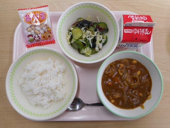 今日の給食は、「かわみなみデ―」、川南町でとれた食べ物をたくさん使った献立です。夏野菜カレーは、川南町産のたまねぎ、ゴーヤ、かぼちゃ、なす、豚肉を使いました。お米も川南町のお米です。いろいろな野菜が入って、色もきれいですね。ゴーヤが日本へ伝わったのは江戸時代といわれ、九州や沖縄で作られるようになりました。ハウスでも栽培され、一年中出回っていますが、6月から8月が旬の野菜です。宮崎県では、沖縄県についで全国で2番目に多く作られています。夏の暑さをしのぐために、日よけとしてグリーンカーテンが注目され、家庭で作られることも増えました。苦手な人もいるかもしれませんが、実はこの苦さに栄養があり、夏バテを防いだり、血圧や血糖値を下げたりする働きがあります。今日は少しだけ入れているので、まずはひと口食べてみてくださいね。今日の川南町でできた食べ物は、米、豚肉、たまねぎ、ゴーヤ、かぼちゃ、なすです。