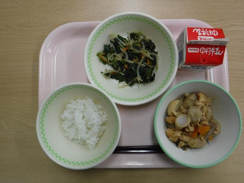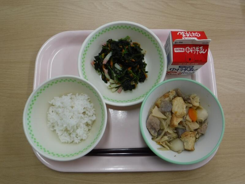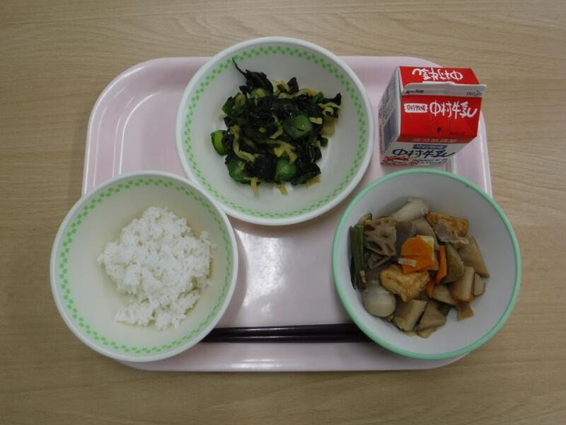 根菜とは、土の中に埋まっている根っこを食べる野菜のことをいいます。今日の根菜汁に入っている根菜は3つあります。どれが根菜か分かりますか? …こたえは、ごぼう、だいこん、にんじんの3つです。今日は、その中から、ごぼうのお話です。ごぼうが日本に伝わってきたのは、縄文時代だと言われています。最初は、薬として使われていました。平安時代くらいから食べるようにもなりましたが、今でも、ごぼうを食べている国は、日本、台湾、韓国など一部の国で、外国人から「木の根っこを食べるなんて」と言われることもあったそうです。そんなごぼうですが、食物繊維がたくさん含まれているので、おなかの中を掃除して、便秘や大腸がんを防ぐ大切な働きをしてくれます。よく噛んで残さず食べましょう。今日の川南町でとれた食べ物は、米、ねぎです。