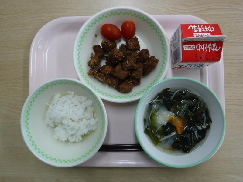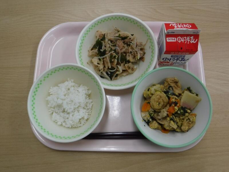 今日は、「海藻」のお話です。長生きする人の食事を調べてみると、海藻をたくさん食べていることがわかりました。海藻に 含まれるミネラルが働いて血管を丈夫にし、血圧を下げてくれるからです。海藻の仲間にはわかめ、こんぶ、もずく、のり、ひじきなどがあります。今日の給食にも海藻が入っているのが分かりますか?今日は、焼きのりを少し混ぜて「いそかあえ」にしました。海藻は、水溶性の食物繊維もたくさん含まれるので、おなかの調子もととのえてくれます。乾燥したものは保存もきくので、使いやすい食材です。わかめをみそ汁に入れたり、ごはんにのりを合わせて食べたりするといいですね。今日の川南町でとれた食材は、米、豚肉、たまねぎです。