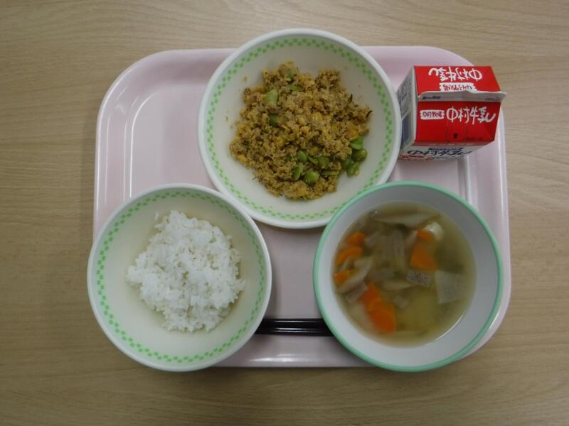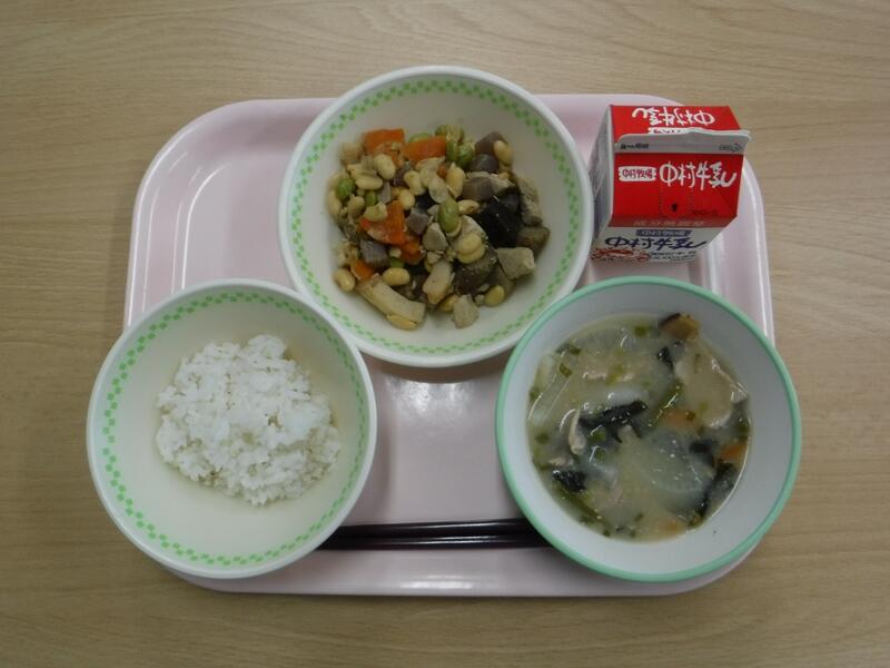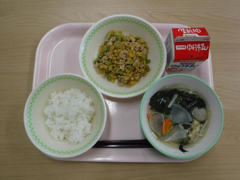 【麦ごはん 枝豆と豆腐のミンチカツ キャベツのおかか和え 根菜汁 牛乳】
