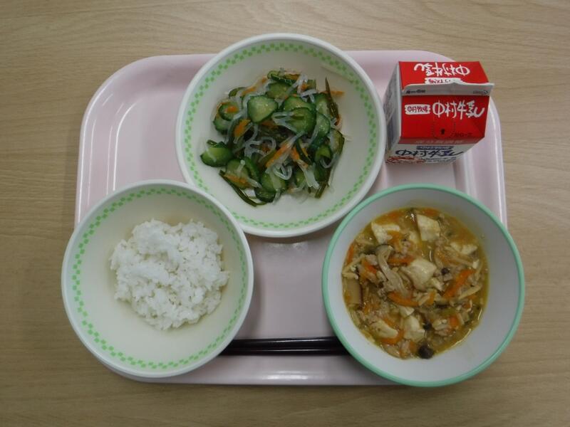 【麦ごはん マーボー豆腐 春雨の酢の物 牛乳】