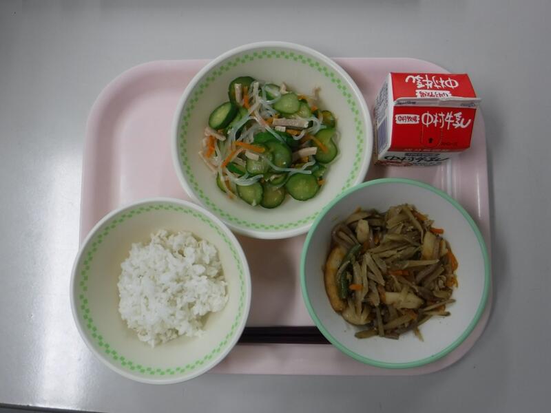 【麦ごはん 五目きんぴら マロニーの酢の物 牛乳】