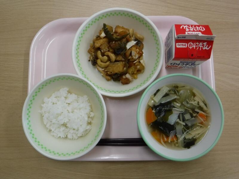 今日はカシューナッツのお話です。カシューナッツはインドやアフリカ、ブラジルなどで作られ、少し甘みがあるナッツです。そのまま食べたり、炒め物に使ったり、お菓子の材料にしたりします。肉や魚に負けないくらいのたんぱく質や脂肪、ビタミンなど色々な栄養が入った食べ物です。今日は油で揚げたカンパチという魚と一緒に、しょうゆ、砂糖、みりん、酒で味付けしました。今日の川南町でできた食べ物は、米、さつまいも、ねぎです。