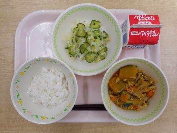 今日は、かぼちゃ、なす、ゴーヤなど、夏野菜をたっぷり使ったカレーでした。カレーに入れると、子ども達の苦手な野菜も食べやすくなりますね