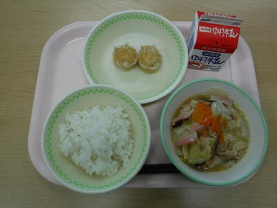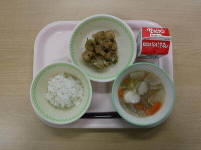 【麦ごはん キャベツと肉団子のスープ煮 大豆と小魚の揚げに 牛乳】