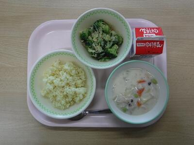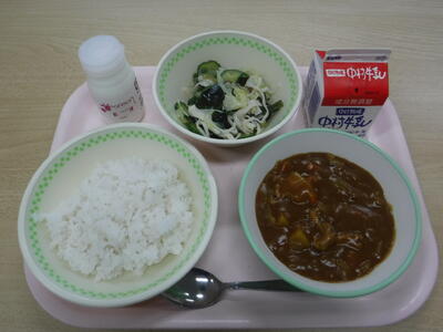 連休明けは、正直ちょっと元気が出ないところですね。今日は、子どもたちが学校に来たくなるようなメニュー、月に1度のカレーです!朝から献立表を見て「やった今日カレーや!」と言っている声が聞こえてきました。給食時間に教室を回ると、「昨日もカレーだった~」という子が今日は多かったような気がします。連休中のごはんはカレーになりがちですよね。カレーの日は本当に驚くほど残菜が少ないです。川南のカレーは、少しスパイシーなのですが、1年生もおいしそうに食べていました。