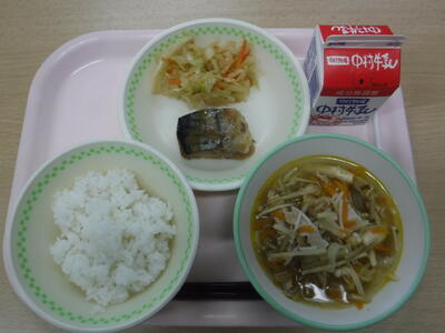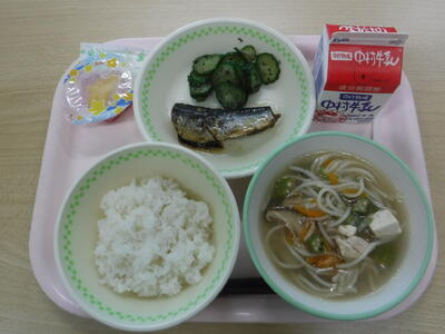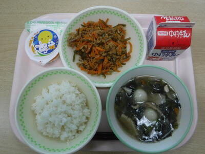 【麦ごはん いわしの生姜煮 野菜のお浸し たまねぎのみそ汁 牛乳】