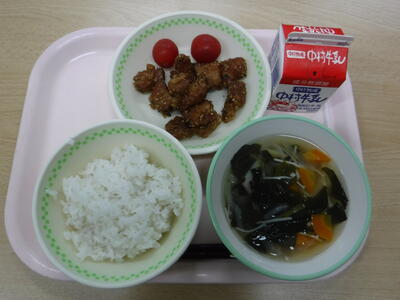 【麦ごはん かつおの香り揚げ ミニトマト(2こ) 根菜汁 牛乳】