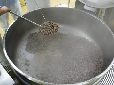↑ 釜で、一度肉を炒めます。(温度が85℃以上に上がっているのを確認)