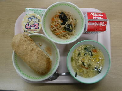 【揚げパン 卵コーンスープ もやしのナムル ムース 牛乳】