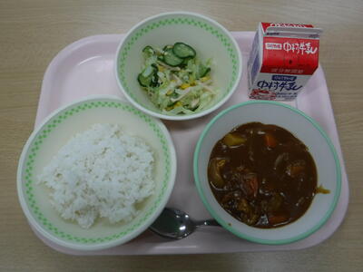 今日のビーフカレーの牛肉は宮崎県産の黒毛和牛を使っています。宮崎県は、年間をとおして暖かくおだやかな気候に恵まれ、自然豊かな地域です。その自然の恵みを生かして、いろいろな農産物、畜産物を作っています。畜産については、「畜産王国みやざき」といわれ、牛肉は全国3位、ぶた肉は全国2位、とり肉は全国1位の生産県です。みなさんが毎日食べている給食にも、宮崎県や川南町で作られた食べ物を多く取り入れ、みなさんにふるさとの味を紹介しています。給食の時間の放送をよく聞いて、ふるさとの自然の恵みに感謝していただきましょう。今日の川南町でできた食べ物は、米、じゃがいも、人参、きゅうり、キャベツです。