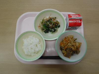 【麦ごはん 秋野菜の煮物 魚そうめん汁 牛乳】