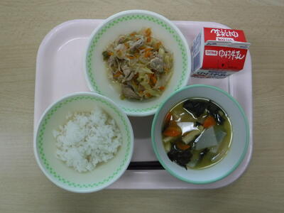 【麦ごはん ホイコーロウ ワンタンスープ 牛乳】