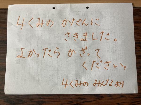 4組が学級園で育てているカサブランカの花を贈ってくれました。