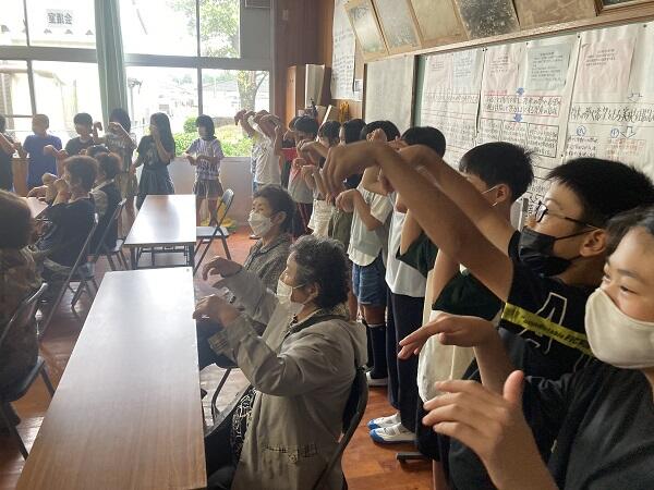 今日の給食から昼休みにかけて、川南西地区の高齢者の方々においでいただき、ふれあい交流会を行いました。