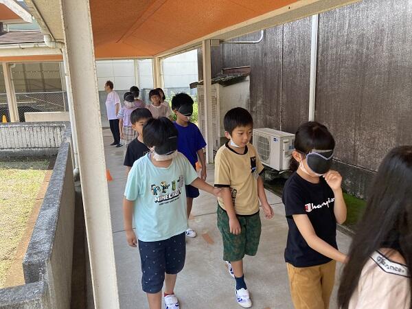 アイマスク体験では、「前が見えなくてこわかった、声かけをするのが難しかった。」