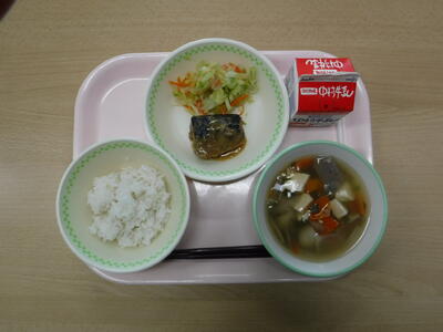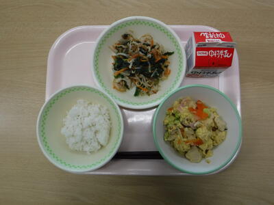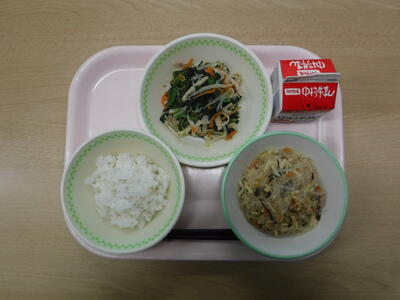 【麦ごはん いわしの生姜煮 のりかつ和え かきたま汁 牛乳】