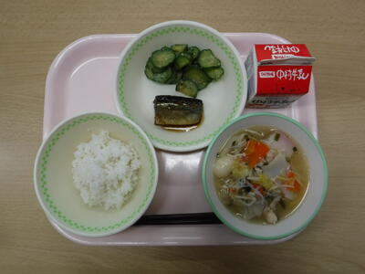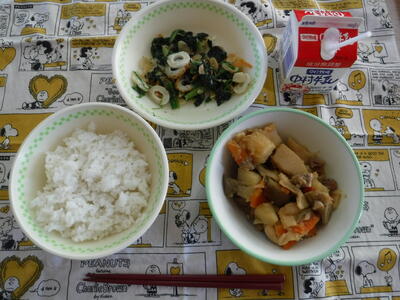 【麦ごはん 茎わかめのきんぴら 石狩汁 牛乳】