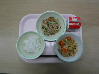 【麦ごはん 大豆の磯煮 千草和え 牛乳】