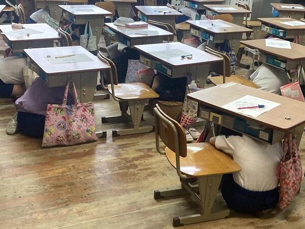 初めに、教室にいる時に地震に遭ったらどんな危険があるかを考えた後に、熊本地震時のニュースなどの画像を見ました。その後、緊急地震速報のデモ音を流し、避難行動をとるところまでを訓練しました。知識として避難の仕方を理解しておくことで、本番に備えたいと考えています。