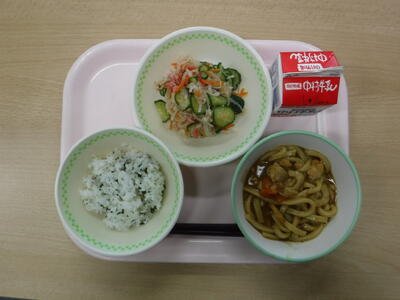 給食メニューは、やきそば、コーンラーメン、カレーうどんでした。