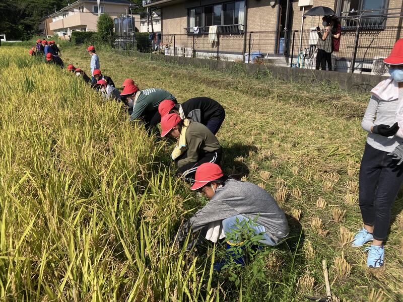 5年生は汗を流しながら、作業していました。稲刈りの経験がある人も、鎌を初めて使う人も、一生懸命活動し貴重な経験を積むことができました。