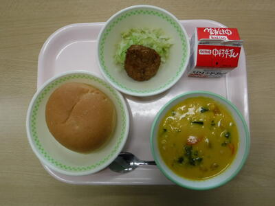 今日は、照焼きバーガーです。バーガーパンに鶏の照焼きパティとキャベツをはさんで食べましょう。10月31日はハロウィンです。ハロウィンは、古代ヨーロッパに暮らしていた原住民ケルト人の収穫感謝祭とキリスト教の祭日「万聖節」の前夜祭が結びついて生まれた行事です。この日に、亡くなった人の霊が家に帰ってくると信じられており、一緒にやって来た悪い霊を追い払うため、「ジャック・オ・ランタン(お化けかぼちゃ)」を作り、お化けや魔女などの仮装をするようになりました。ハロウィン発祥の地とされるアイルランドでは、ドライフルーツ入りの「バームブラック」というケーキを作り、この中に指輪や布切れなどを入れておき、運勢を占う風習があるそうです。今日のポタージュはハロウィンにちなんで、かぼちゃを使い、パンプキンポタージュにしました。今日の川南町でできた食べ物は、キャベツ、パセリ、パンプキンポタージュに使われている牛乳です。