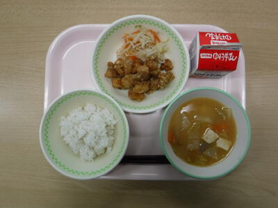 【麦ごはん 鶏肉の唐揚げ もやしのレモン和え キムチ汁 牛乳】