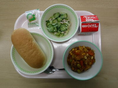 今日は、給食にかかわっている人のお話です。給食のパンは、宮崎市の佐土原にある長田パン工場で作っています。 朝早く、みなさんが眠っている暗いうちから仕事にはげんでいます。給食センターやパン屋さんのほかにも、牛乳やさん、野菜を作る農家の人たち、豆腐やさん、肉やさんなど、 たくさんの人たちが関わって給食はできあがります。食べることは、私たちが生きていくのになくてはならないことです。世界の国々には、今日食べるものもなく、困っている国があることも忘れないでください。嫌いだから残すのではなく、まずはひと口食べてみること、そして、自分の食べられる量に調整したら、責任をもって残さず食べましょう。今日の川南町でできた食べ物は、豚肉、にんじん、キャベツ、きゅうりです。