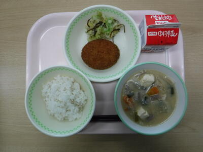 【麦ごはん 日向鶏コロッケ はくさいの塩昆布和え トロン汁 牛乳】
