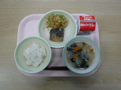 みなさん、魚は好きですか?「魚を食べると、頭がよくなる」と言われるように、魚は、頭の働きをよくしてくれる「DHA」という栄養素を含んでいます。特に、今日のような「さば」や「いわし」など、背なかが青色をしている魚にはたくさん含まれています。お魚は、給食だけでなく、おうちでもたくさん食べてほしい食べ物です。今日のさばは、圧力をかけてやわらかくしてあるので、骨まで食べられます。カルシウムたっぷりでみなさんの骨を強くしてくれますよ。よくかんで食べましょう。今日の川南町でできた食べ物は、米、たまねぎ、キャベツです。