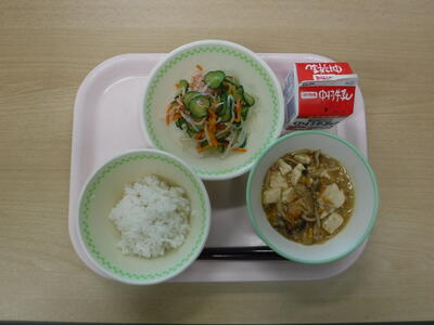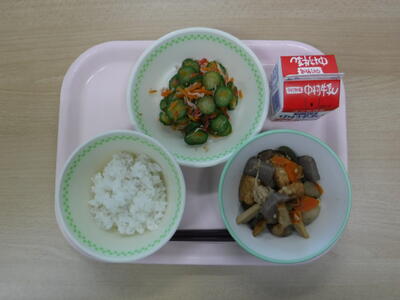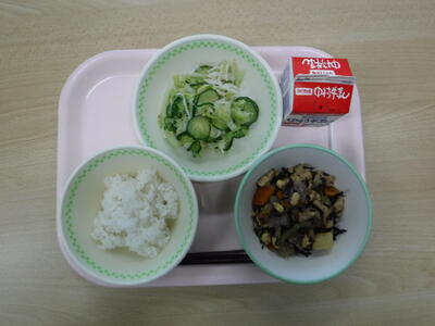 今日は、国光原中学校3年生のリクエスト献立です。今からクイズを出すので、みなさん考えてみて下さい。では、問題です。大豆を発酵させて作る納豆の仲間ではないものは、どれでしょうか。①甘納豆 ②寺納豆 ③ひきわり納豆 答えは………①の甘納豆です。甘納豆は、小豆、うずら豆、いんげん豆などを砂糖で煮て作るお菓子で、納豆ではありません。納豆には、糸引き納豆と寺納豆の2種類があります。糸引き納豆は蒸した大豆をわらに包んで自然に発酵させるか、納豆菌をかけて発酵させるものです。大豆を小さく切ってから作るひきわり納豆も、同じ作り方です。寺納豆は、昔、中国から伝わった「豆鼓」が元祖で、納豆菌ではなく麹菌で発酵させた後、乾燥させるのでねばりはありません。塩を加えた保存食なので塩辛納豆ともいい、京都の大徳寺納豆、静岡県にある浜名湖の浜納豆が有名です。納豆は昔、寒い冬に作られていたので、俳句では冬の季語にもなっています。 今日の川南町でできた食べ物は、米、豚肉、きゅうりです。