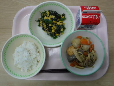 【麦ごはん 高野豆腐の卵とじ ほうれん草のごま和え 牛乳】