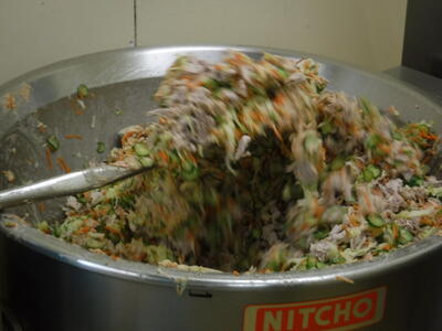 春雨は、細長い形が春の雨を思い出させるということから、この名前がつきました。春雨は、いもや豆のデンプンから作られます。じゃがいもやさつまいものデンプンから作られる春雨は、日本で昭和10年代に作られました。水分を吸いやすく、すぐやわらかくなります。中国春雨ともいわれる緑豆春雨は、熱湯に入れてもコシがあり、のびにくいです。今日のサラダには、緑豆春雨を使いました。つるっと口に入って、食べやすいですね。今日の川南町でできた食べ物は、米、ぶた肉、きゅうりです。