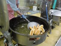 調理場は、①パンを揚げ油の釜に入れる人 ②パンを揚げる人 ③揚がったパンにすばやくきなこ砂糖をまぶしてパン箱に並べる人 ④パン箱を移動させたり、粉を上からかけたりする人 と、調理員さんに早出してもらい忙しくなりましたが、子ども達がおいしく食べてくれたらという思いで作りました。久しぶりの揚げパン、おいしかったですね