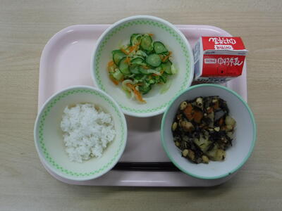 みなさんは、大豆が「畑の肉」と言われていることを知っていますか。大豆には、肉に負けないくらい良いたんぱく質が多く含まれているため、このように呼ばれています。大豆にはたんぱく質の他にも、鉄、ビタミン、食物繊維が含まれています。大豆はさまざまな加工食品に変身していて、味噌、しょうゆ、豆腐、油揚げ、納豆など私たちの生活とは切ってもきれない存在になっています。体に良い栄養がたくさん含まれている大豆やその大豆から作られる大豆製品を食べて、毎日元気にすごしましょう。今日は、ひじきを入れて栄養たっぷりの「磯煮」にしました。残さず食べましょう。今日の川南町でできた食べ物は、米、じゃがいも、きゅうり、キャベツです。