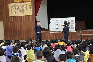 梅田学園自動車学校の方が来校し、横断歩道の渡り方や、衝突したときの衝撃力について話を聞きました。自動車の時速40キロメートルの車が段ボール人形にぶつかる実験がありました。子ども達は驚いていました。