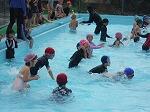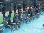 1年生は、今日も元気に泳いでいました。元気いっぱいです。水が少々苦手な児童もいますが、先生の上手な導きで、楽しそうに水遊びに興じていました。また、初めて大プールの方に入りましたが、水深を下げているので、安心して泳いで(歩いて)いました。