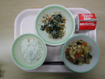 【麦ごはん 五目煮 おかかあえ 牛乳】